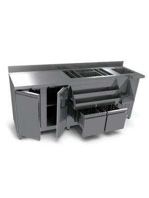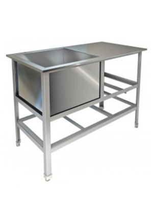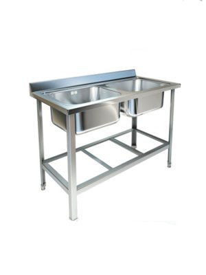 Ванна с двумя сварными моечными отделениями из нержавеющей стали не подвержена коррозии, легко очищается от загрязнений. Каркас сварной из профиля толщиной 2 мм с порошковым напылением серого цвета. Кромки ванны имеют подгиб. Ножки оснащены винтовыми опорами для регулировки высоты.